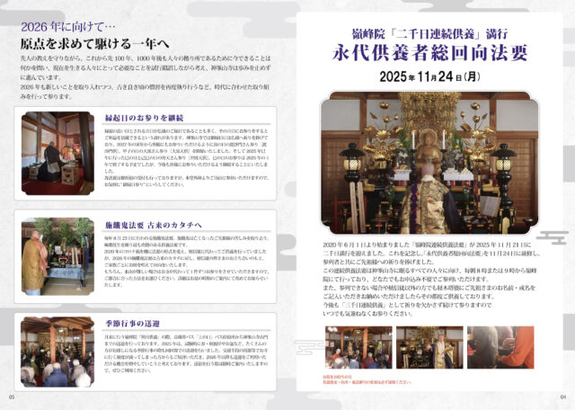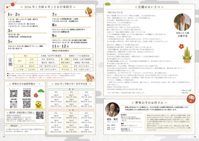 神峯山寺だより2026年版 完成しました! 神峯山寺 3日前 神峯山寺だより2026_P1-8 毎年年末に発行している「神峯山寺だより」 2025年の出来事や 2026年に向けての取り組みなどの情報を詰め込んだ内容です。 神峯山寺の各お堂をはじめ、 JR高槻駅の観光案内所、阪急高槻市の高槻市観光協会にて 配架いたします。 見かけましたら、ぜひお手にとってご覧ください。 神峯山寺 神峯山寺だより2026_P1-8 神峯山寺だより2026_P2-3 神峯山寺だより2026_P4-5 神峯山寺だより2026_P6-7